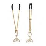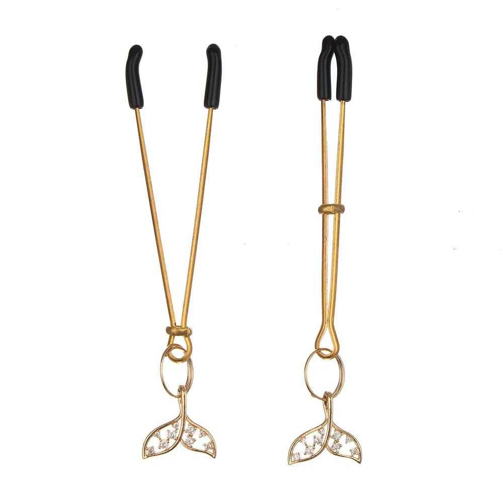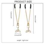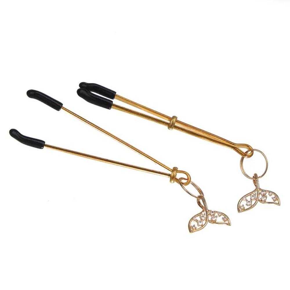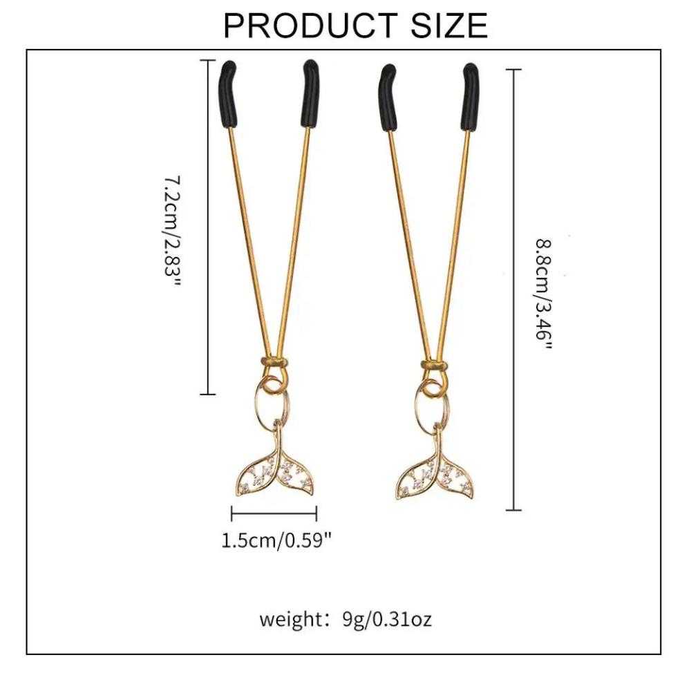 Göğüs ucu uyarımında estetik ve şıklığı bir araya getiren bu özel tasarım mandallar, altın rengi metal gövdesi ve zarif figür detaylarıyla dikkat çeker. Ucundaki denizkızı kuyruğu şeklindeki taşlı figürler, ürüne zarafet katarken aynı zamanda fanteziye romantik bir dokunuş sunar.